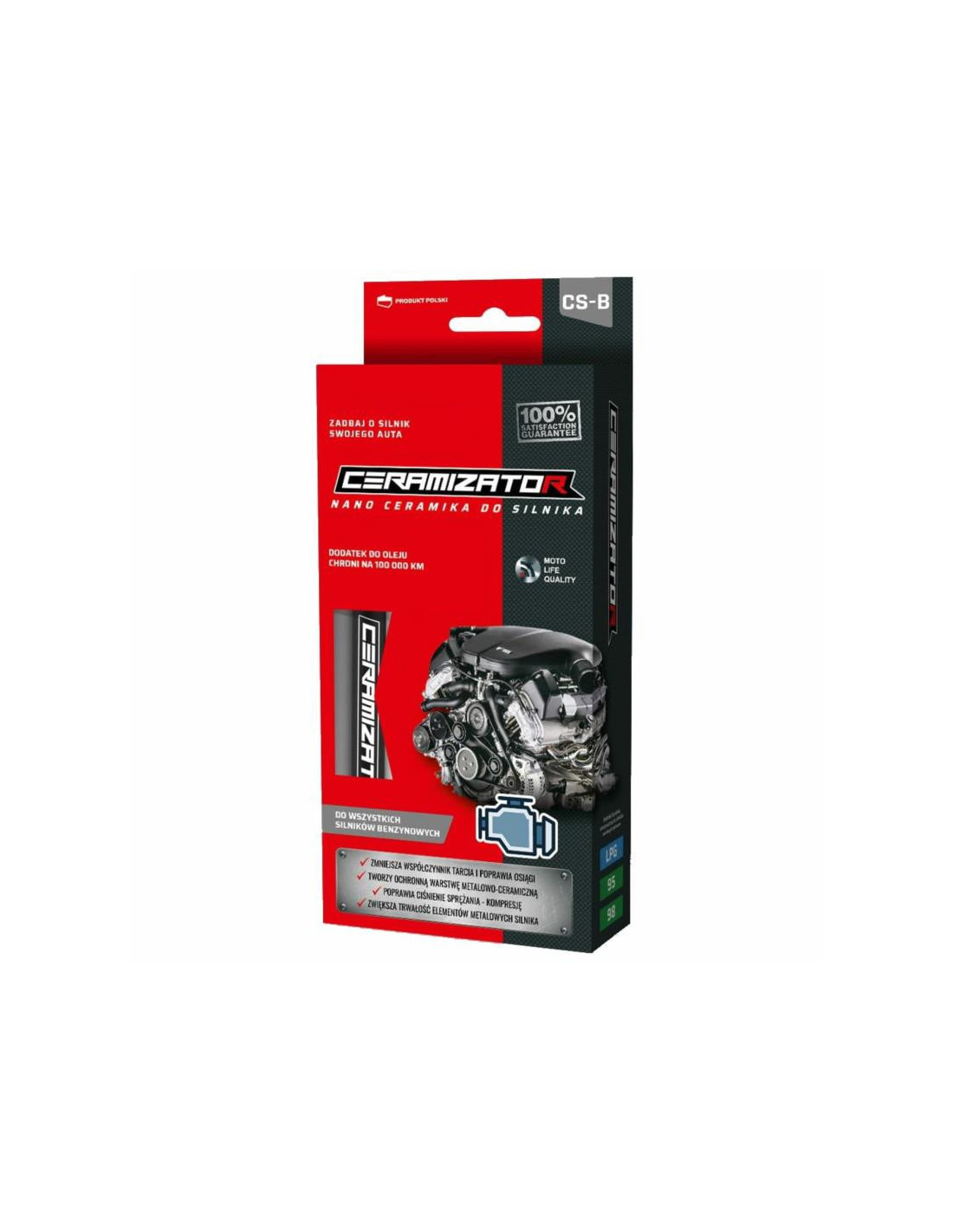 CERAMIZATOR CS-B – wysokiej jakości preparat, przeznaczony do ochrony i rewitalizacji silników benzynowych. Innowacyjna formuła inteligentnych nano cząsteczek o wysokiej zdolności powierzchniowo czynnej wnika w strukturę metalu tworząc wytrzymałą stabilną powłokę ochronną (ceramiczno-metalową) o niskim współczynniku oporu i doskonałych właściwościach przewodności cieplnej. Pozwala to na znaczną redukcję tarcia oraz stałą ochronę podzespołów, praktycznie eliminując proces ich zużycia. Regularne stosowanie pozwala znacząco wydłużyć żywotność silnika. Zapewnia ochronę na 100 000 KM.