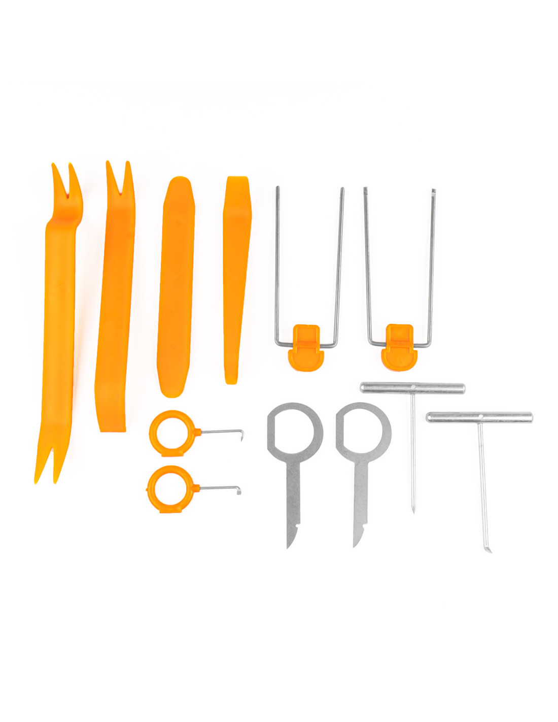 Oferowany zestaw składa się z 12 różnych otwieraków, które wykorzystasz przy demontażu tapicerki, karoserii, radioodbiorników, nawigacji, uszczelek, osłon drzwi lub kokpitu w swoim aucie.