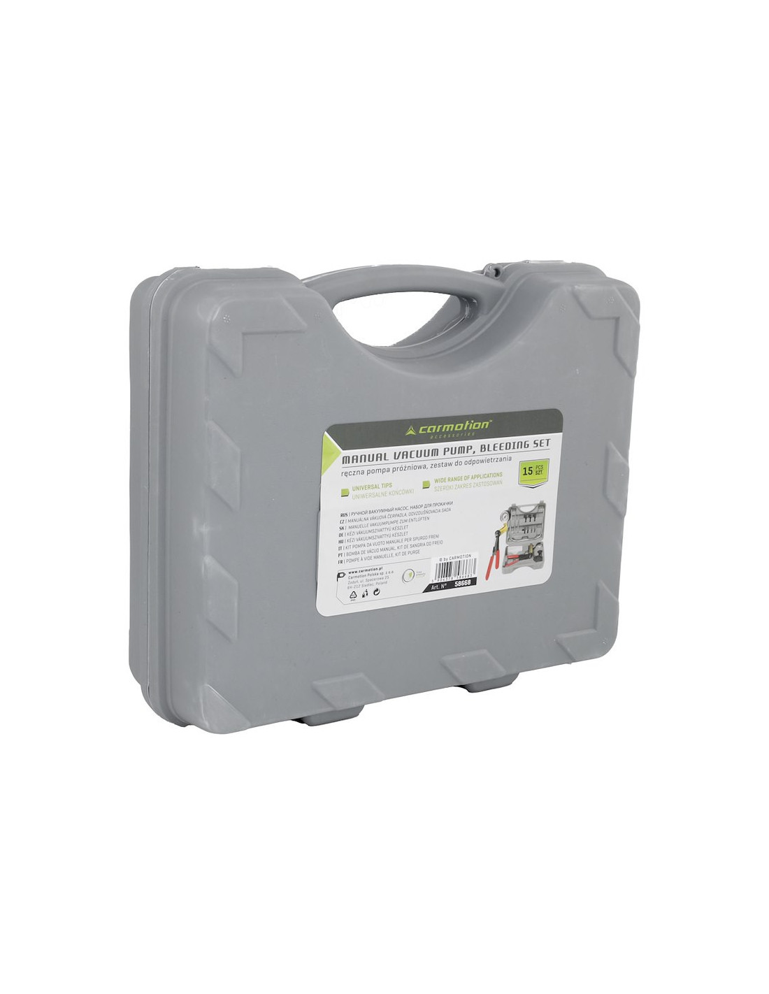 Ręczna pompa próżniowa, zestaw do odpowietrzania. Zestaw pozwala na diagnozowanie wszystkich silników spalinowych Diesla oraz benzyny w praktycznie każdym silniku, czy też układzie. Służy do odpowietrzania układu hamulcowego oraz do sprawdzania poprawności działania: układu zasilania paliwa, czujników ciśnienia, zaworu recyrkulacji spalin, przepustnicy, regulatora ciśnienia paliwa, modulatora ciśnienia w automatycznych skrzyniach biegów, wspomagania hamulców itp. Miernik pozwala szybko i dokładnie sprawdzić poziom kompresji w silnikach. Dzięki akcesoriom pasuje do wszystkich samochodów osobowych.