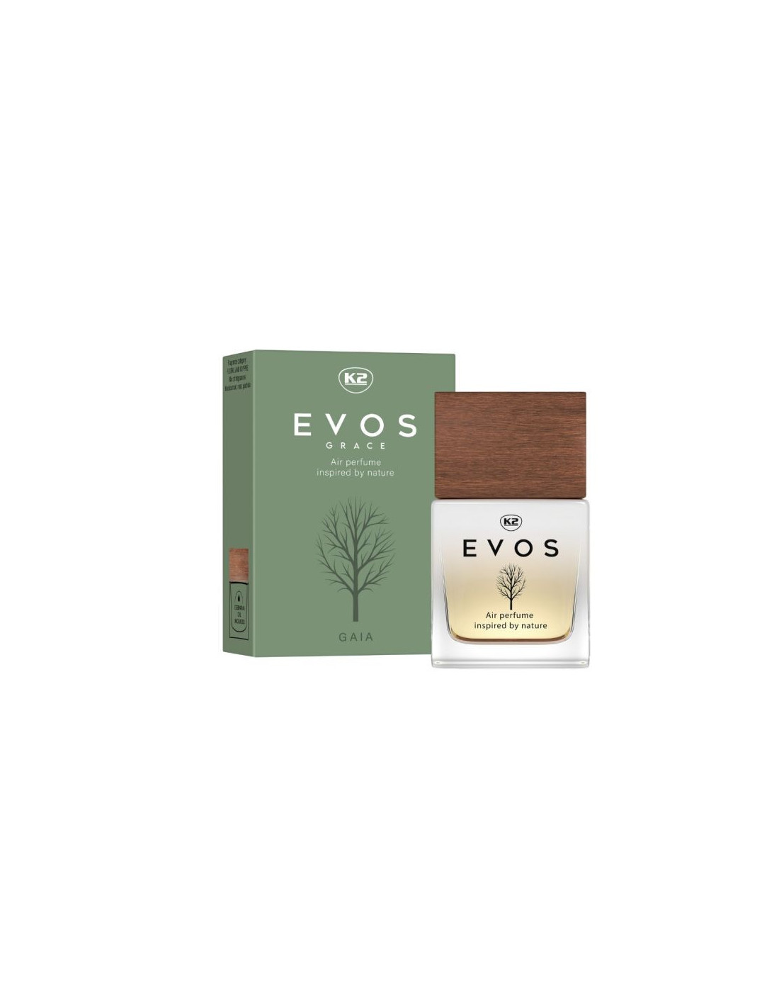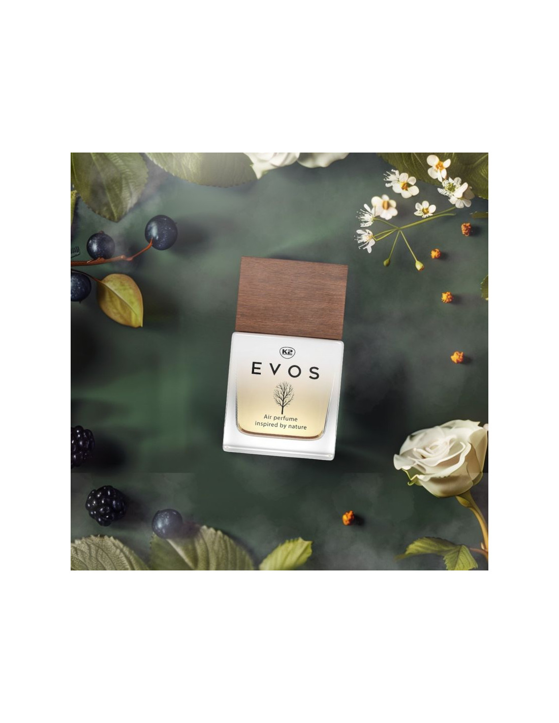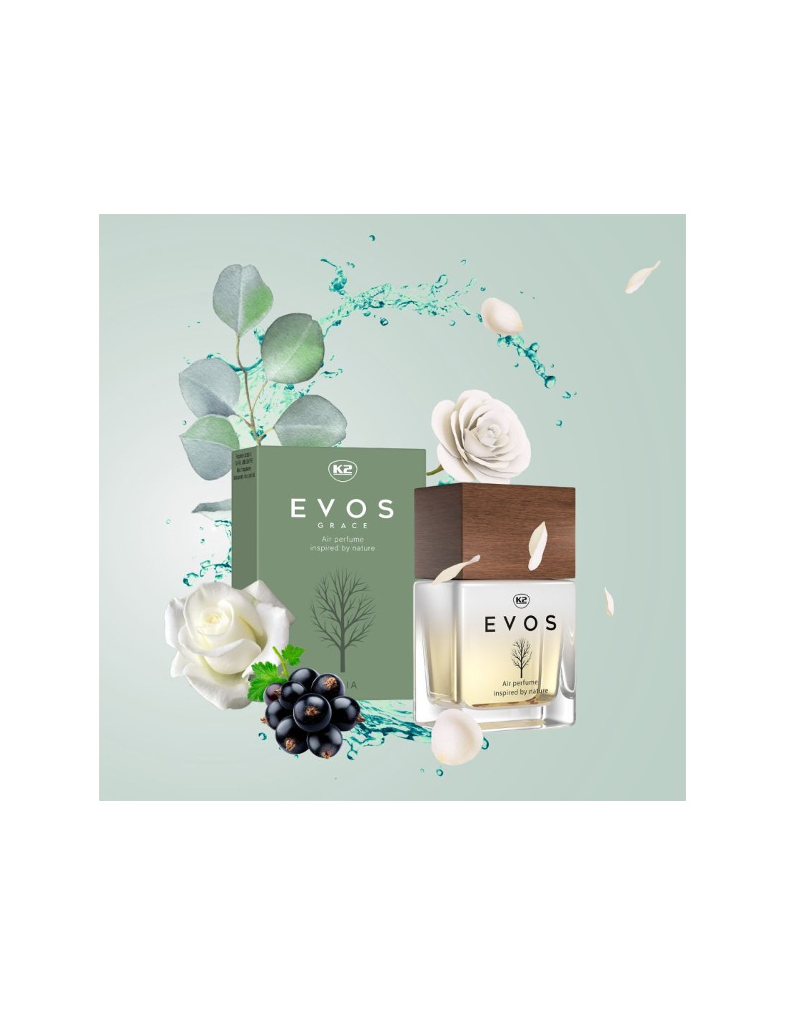 Perfumy do samochodu K2 EVOS GRACE to inspirowana naturą, niezwykła kompozycja wyjątkowych nut zapachowych, zaprojektowana z myślą o wnętrzach nowoczesnych aut.